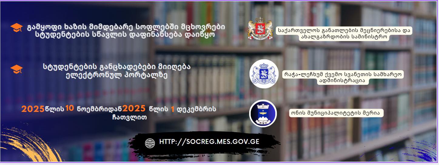 სტუდენტების განცხადებები მიიღება ელექტრონულ პორტალზე http://socreg.mes.gov.ge 2025 წლის 10 ნოემბრიდან 2025 წლის 1 დეკემბრის ჩათვლით.