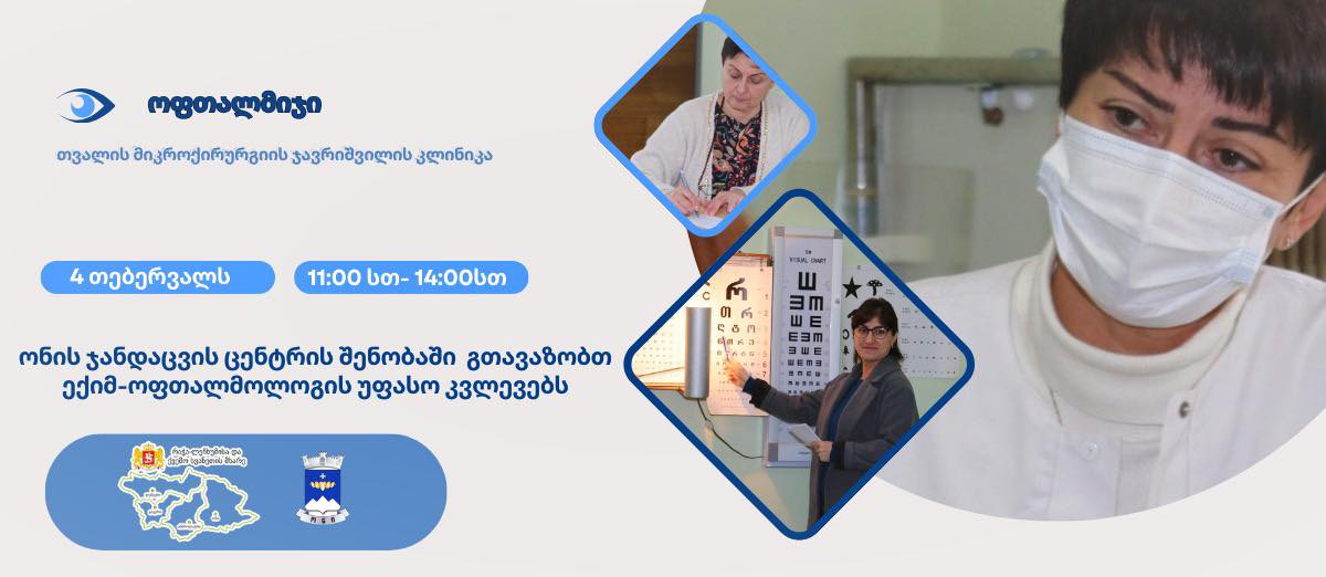 რაჭა-ლეჩხუმ ქვემო სვანეთის სამხარეო ადმინისტრაციის და ონის მუნიციპალიტეტის მერიის ხელშეწყობით, 4 თებერვალს, ოთხშაბათს, 11:00 საათიდან – 14:00 საათამდე, შოთა ბუგიანიშვილის სახელობის რეგიონალური ჯანდაცვის ცენტრის შენობაში თვალის მიკროქირურგიის ჯავრიშვილის კლინიკა “ოფთალმიჯი“ ატარებს უფასო კონსულტაციას.